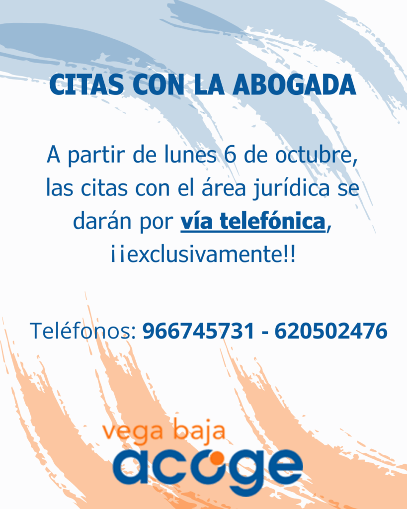 Las citas con el área jurídica se darán exclusivamente por teléfono los lunes a las 8:00. 966745731 – 620502476